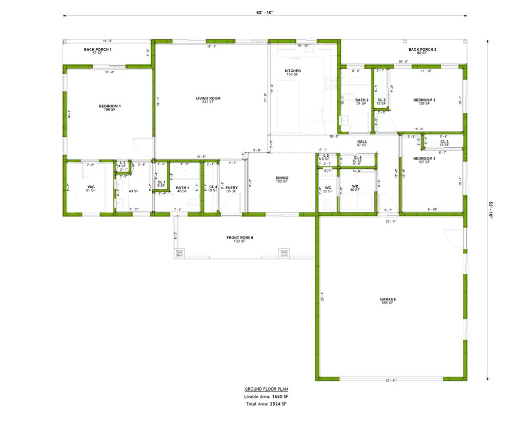 This Craftsman 3-bed/2.5-bath home is 1650 sf of interior living space. There are also 3 covered porches and a garage, bringing the total footprint to 2524 sf. This plan set is engineered for steel with 2"x4" interiors/exteriors, with 2"x6" exterior steel framing available as an add-on option. While the plan shows Light Gauge Steel framing, you can also reference it to fully build in wood. Each set comes with a Comprehensive Generic-Materials Shopping List, a Lighting-Plumbing-HVAC plan, and a Building Instructions Guide. INCLUDES DETAILED TRUSS/ROOF PLAN