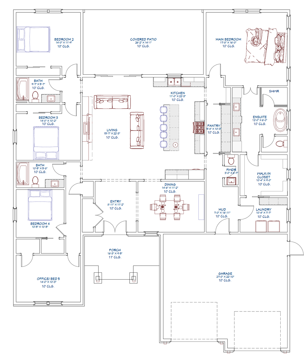 • Foundation Plan(s): Plan representation indicating the general design intent of the foundation. The foundation plan will show a slab, crawl space, or basement. Typically, this includes the footing layout, dimensioned lines to exterior and interior footers, depending on what type of foundation is purchased. All structural and load bearing components will be provided by local engineering as required based on specific site and earth composition.