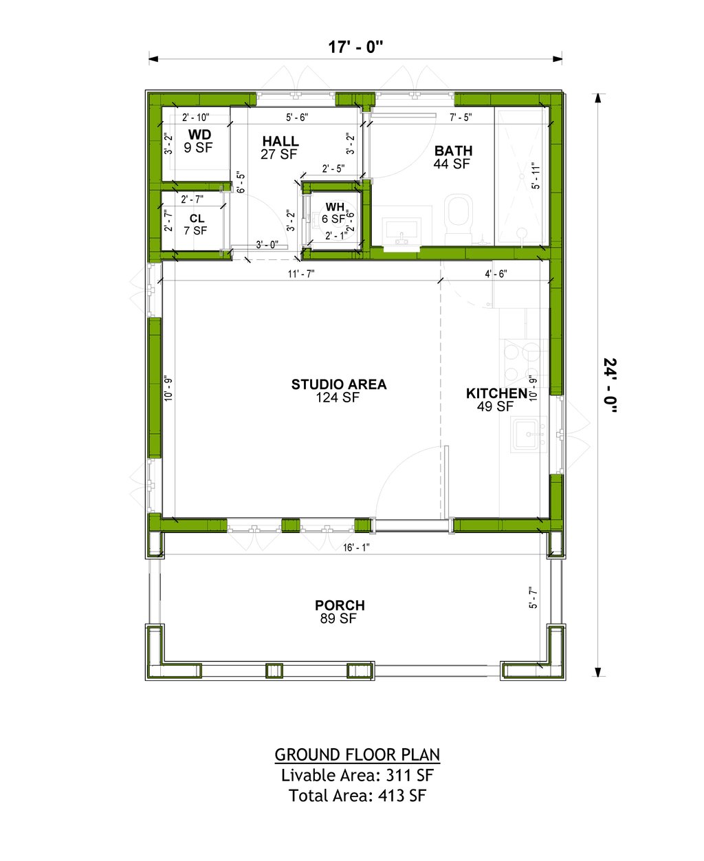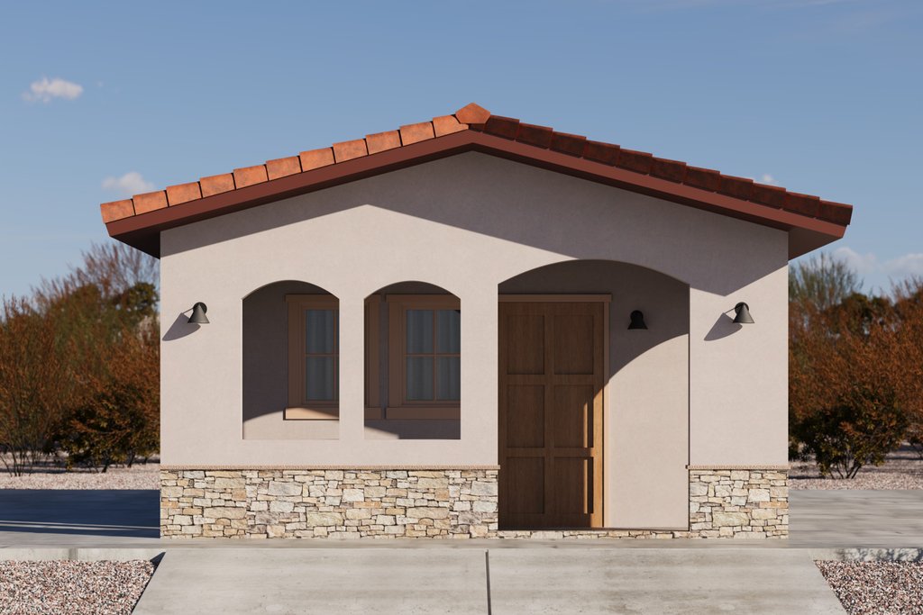 This Spanish Studio home is 311 sf of interior living space. There is also a covered porch, bringing the total footprint to 413 sf. This plan set is engineered for steel with 2"x4" interiors/exteriors, with 2"x6" exterior steel framing available as an add-on option. While the plan shows Light Gauge Steel framing, you can also reference it to fully build in wood. Each set comes with a Comprehensive Generic-Materials Shopping List, a Lighting-Plumbing-HVAC plan, and a Building Instructions Guide. INCLUDES DETAILED TRUSS/ROOF PLAN