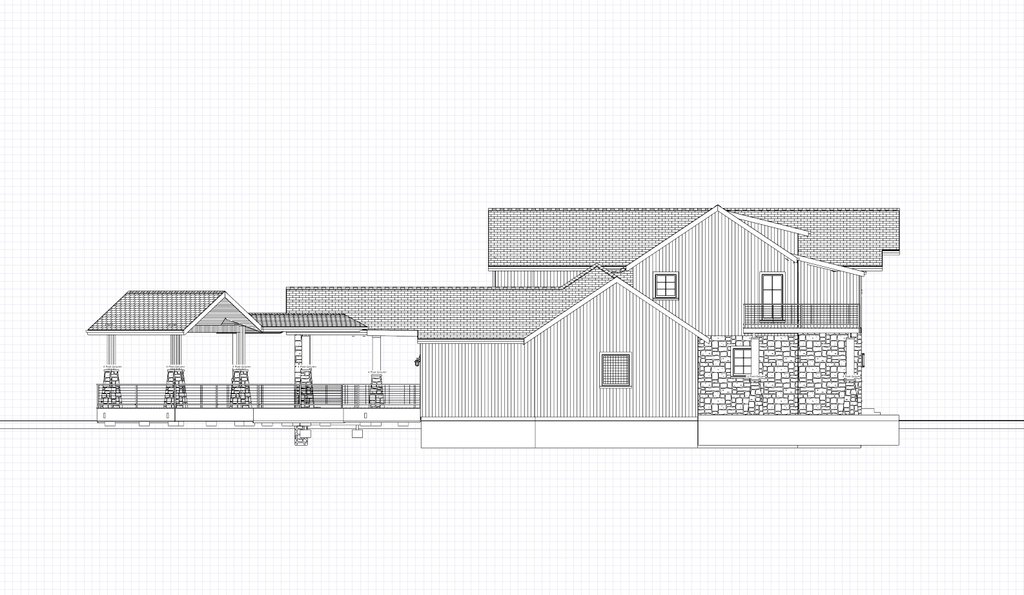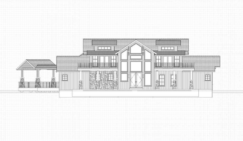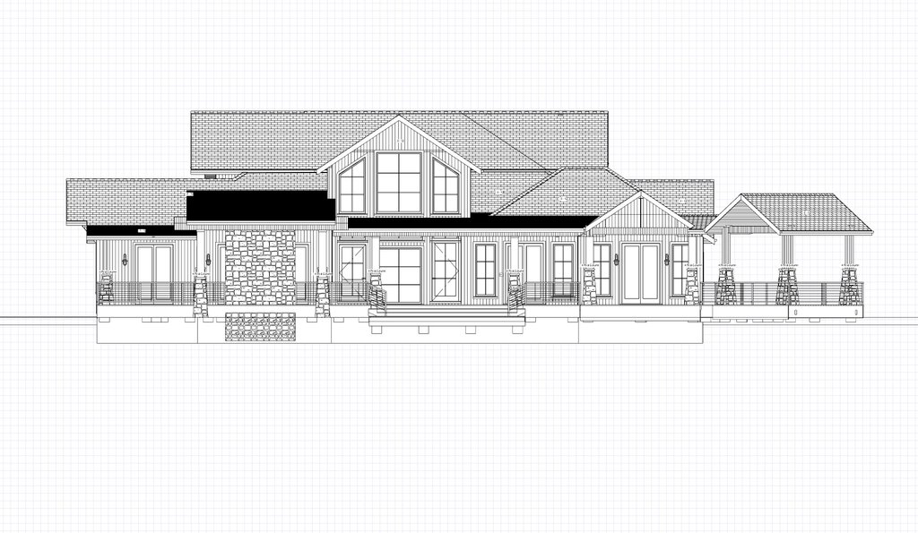 • Exterior Elevations: Elevations are a 2d representation of each side of the house. They typically indicate the materials for the walls, roof, and other elements that are part of the home. Labels for Doors and Windows, as well as key height markers are included.
