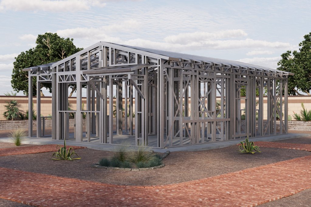 This Spanish 1-bed/1-bath home is 495 sf of interior living space. There is also a covered side porch, bringing the total footprint to 594 sf. This plan set is engineered for steel with 2"x4" interiors/exteriors, with 2"x6" exterior steel framing available as an add-on option. While the plan shows Light Gauge Steel framing, you can also reference it to fully build in wood. Each set comes with a Comprehensive Generic-Materials Shopping List, a Lighting-Plumbing-HVAC plan, and a Building Instructions Guide. INCLUDES DETAILED TRUSS/ROOF PLAN