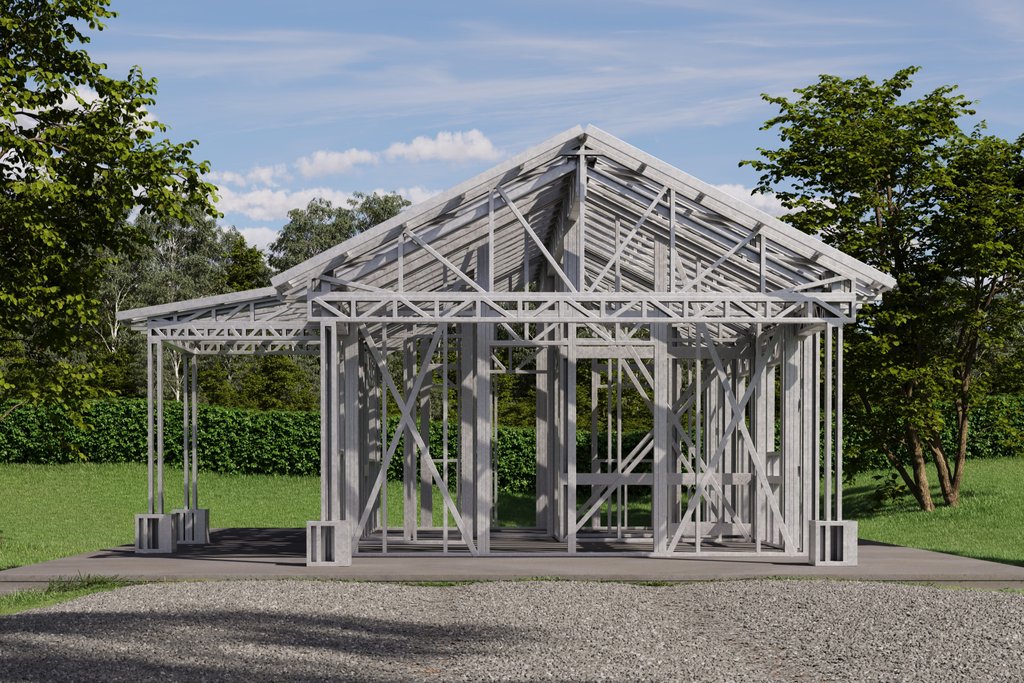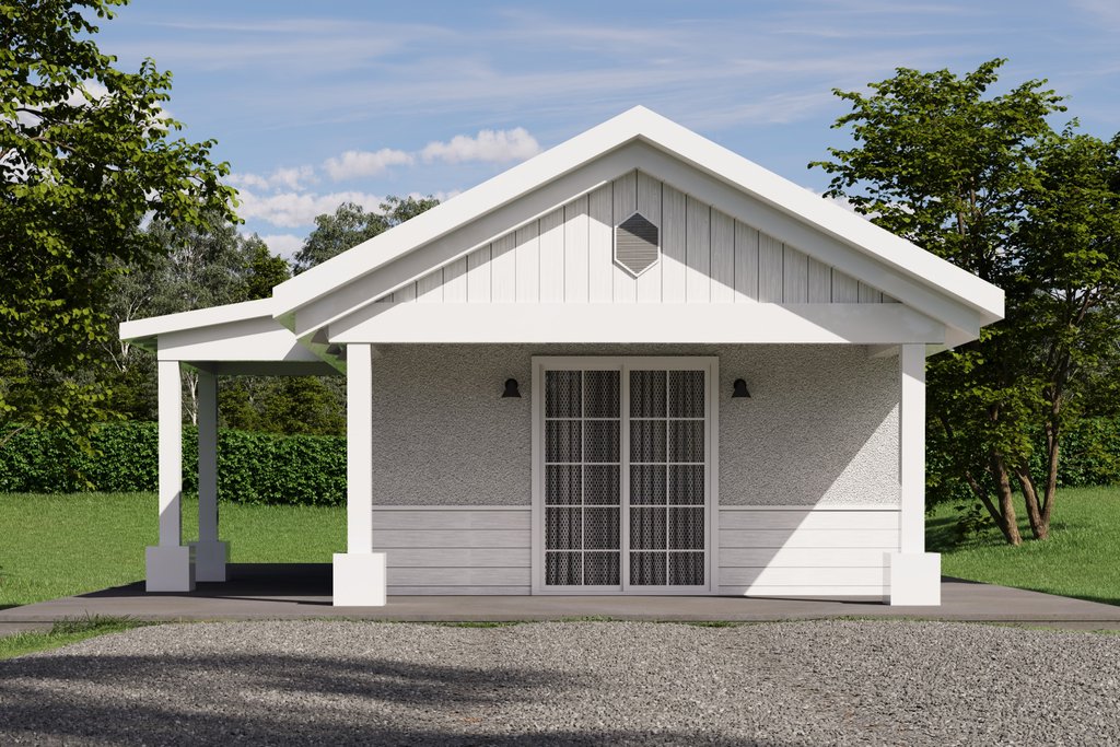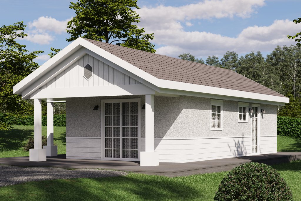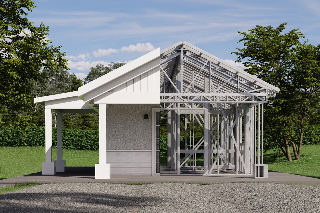 This Traditional style 1-bed/1-bath home is 499 sf of interior living space. There are also covered front and side porches, bringing the total footprint to 651 sf. This plan set is engineered for steel with 2"x4" interiors/exteriors, with 2"x6" exterior steel framing available as an add-on option. While the plan shows Light Gauge Steel framing, you can also reference it to fully build in wood. Each set comes with a Comprehensive Generic-Materials Shopping List, a Lighting-Plumbing-HVAC plan, and a Building Instructions Guide. INCLUDES DETAILED TRUSS/ROOF PLAN