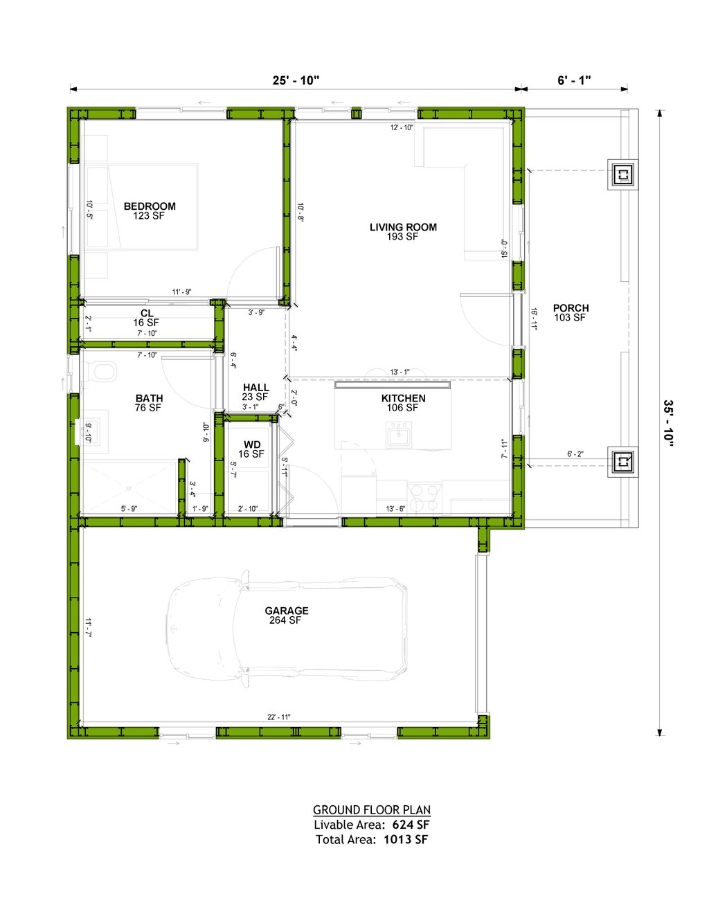 This Craftsman 1-bed/1-bath home is 624 sf of interior living space. There is also a covered front porch and garage, bringing the total footprint to 1013 sf. This plan set is engineered for steel with 2"x4" interiors/exteriors, with 2"x6" exterior steel framing available as an add-on option. While the plan shows Light Gauge Steel framing, you can also reference it to fully build in wood. Each set comes with a Comprehensive Generic-Materials Shopping List, a Lighting-Plumbing-HVAC plan, and a Building Instructions Guide. INCLUDES DETAILED TRUSS/ROOF PLAN