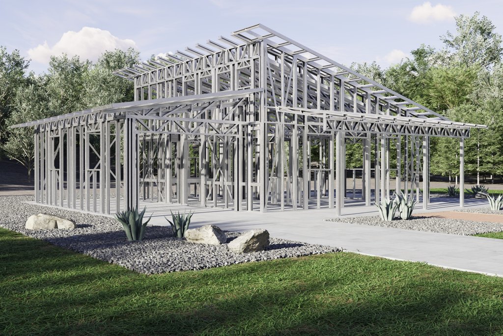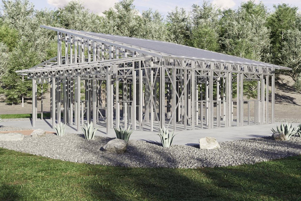 Designed for use as a PEMB (Pre-Engineered Metal Building) using Z8 metal framing with insulated panels on the exterior and 2x4" studs for the interior.
