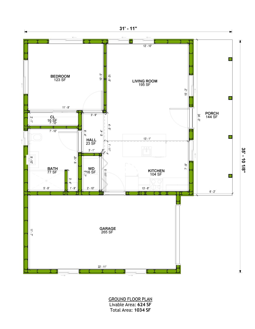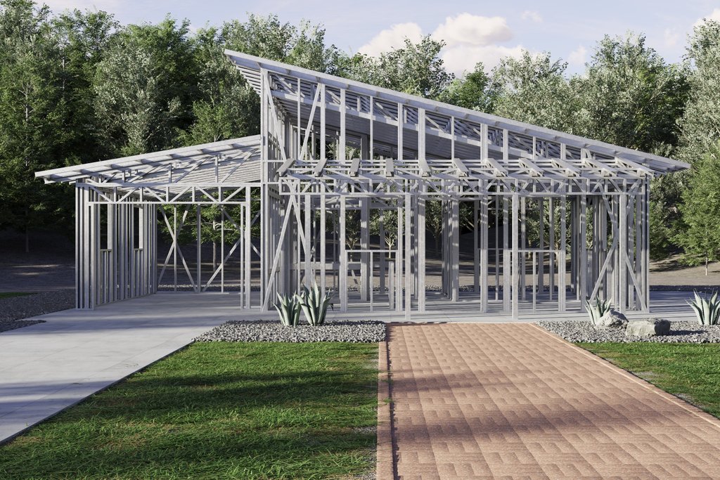 This Modern 1-bed/1-bath home is 624 sf of interior living space. There is also a covered front porch and a garage, bringing the total footprint to 1034 sf. This plan set is engineered for steel with 2"x4" interiors/exteriors, with 2"x6" exterior steel framing available as an add-on option. While the plan shows Light Gauge Steel framing, you can also reference it to fully build in wood. Each set comes with a Comprehensive Generic-Materials Shopping List, a Lighting-Plumbing-HVAC plan, and a Building Instructions Guide. INCLUDES DETAILED TRUSS/ROOF PLAN