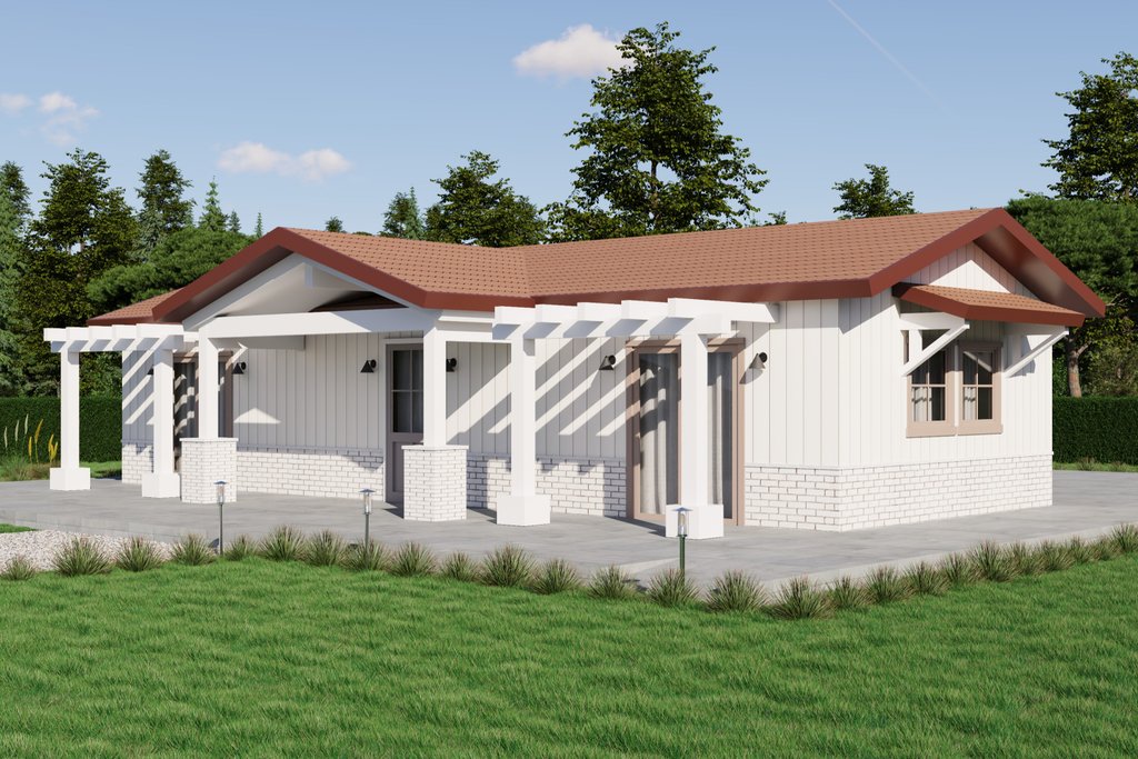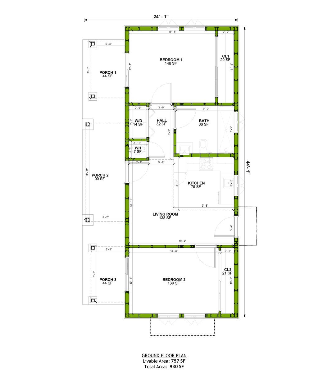 This Traditional 2-bed/1-bath home is 757 sf of interior living space. There is also a large covered front porch, bringing the total footprint to 930 sf. This plan set is engineered for steel with 2"x4" interiors/exteriors, with 2"x6" exterior steel framing available as an add-on option. While the plan shows Light Gauge Steel framing, you can also reference it to fully build in wood. Each set comes with a Comprehensive Generic-Materials Shopping List, a Lighting-Plumbing-HVAC plan, and a Building Instructions Guide. INCLUDES DETAILED TRUSS/ROOF PLAN