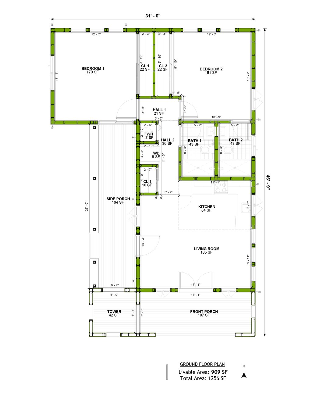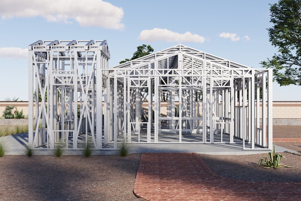 This Spanish home is 909 sf of living space, which includes 2 bedrooms, 2 bathrooms, a living area, and a kitchen. This home also has a spacious wrap-around porch that includes a statement tower, bringing the total footprint to 1256 sf. This plan set is engineered for steel with 2"x4" interiors/exteriors, with 2"x6" exterior steel framing available as an add-on option. While the plan shows Light Gauge Steel framing, you can also reference it to fully build in wood. Each set comes with a Comprehensive Generic-Materials Shopping List, a Lighting-Plumbing-HVAC plan, and a Building Instructions Guide. INCLUDES DETAILED TRUSS/ROOF PLAN