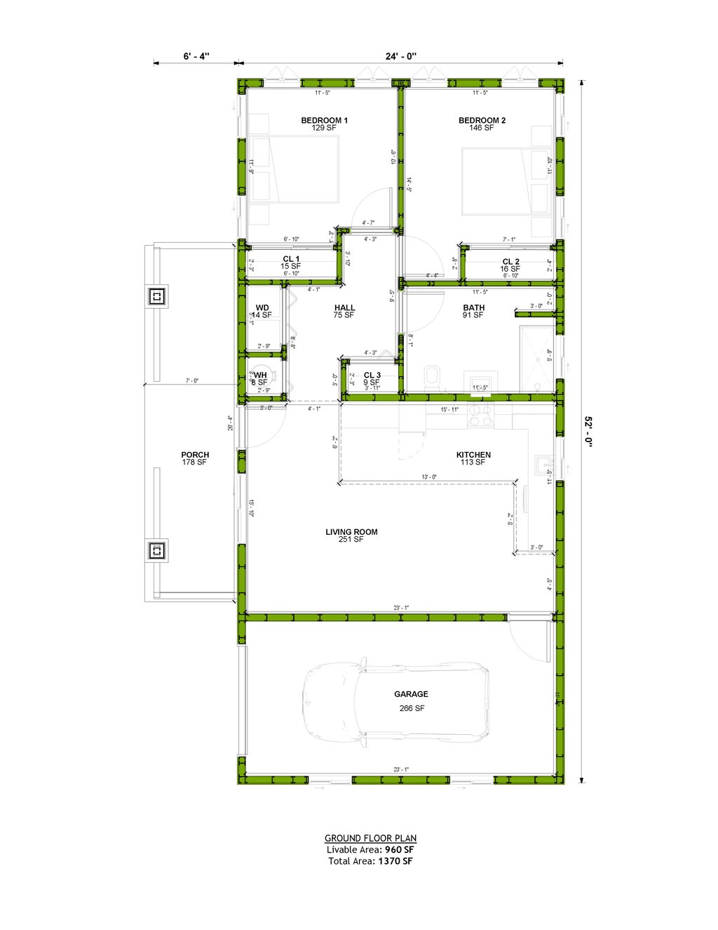 This Craftsman 2-bed/1-bath home is 960 sf of interior living space. There is also a covered front porch and a garage, bringing the total footprint to 1370 sf. This plan set is engineered for steel with 2"x4" interiors/exteriors, with 2"x6" exterior steel framing available as an add-on option. While the plan shows Light Gauge Steel framing, you can also reference it to fully build in wood. Each set comes with a Comprehensive Generic-Materials Shopping List, a Lighting-Plumbing-HVAC plan, and a Building Instructions Guide. INCLUDES DETAILED TRUSS/ROOF PLAN
