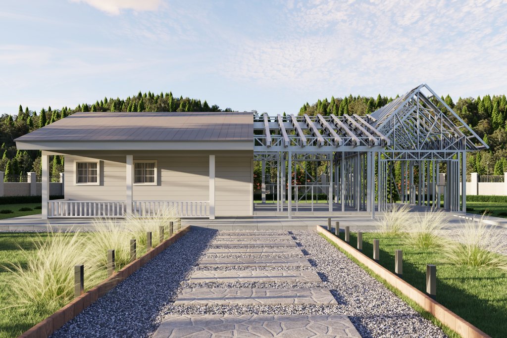 This Farmhouse 2-bed/1-bath home is 960 sf of interior living space. There is also a covered front porch and a garage, bringing the total footprint to 1497 sf. This plan set is engineered for steel with 2"x4" interiors/exteriors, with 2"x6" exterior steel framing available as an add-on option. While the plan shows Light Gauge Steel framing, you can also reference it to fully build in wood. Each set comes with a Comprehensive Generic-Materials Shopping List, a Lighting-Plumbing-HVAC plan, and a Building Instructions Guide. INCLUDES DETAILED TRUSS/ROOF PLAN